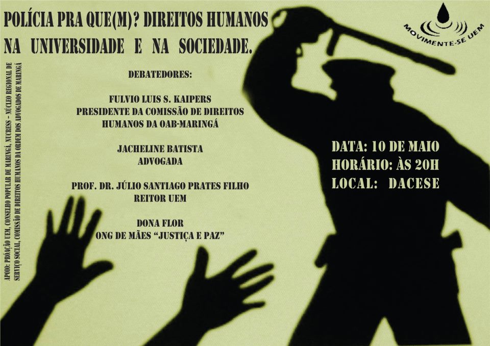 A constante presença da polícia militar no campus, assim como a certeza de haver os chamados “P2” e policiais à paisana em nossa Universidade nos leva a algumas questões: qual o real objetivo da entrada da PM na UEM? Qual o tipo de segurança que precisamos e queremos em nossa Universidade? Polícia para que e para quem? E os direitos humanos?