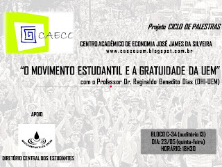 O tema será: O Movimento Estudantil e a Gratuidade da UEM, tendo como palestrante o Professor Doutor Reginaldo Benedito Dias.